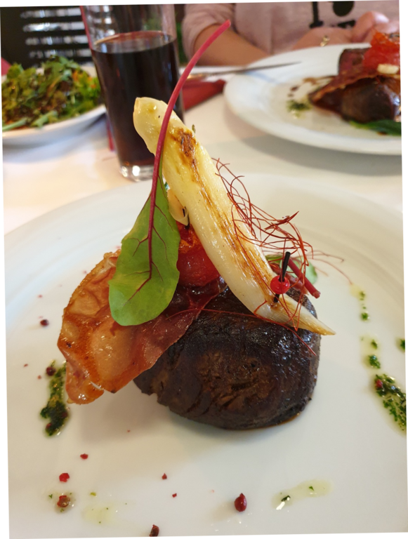 2.Schweinefilet in Speckmantel mit Pfeffer-Rahm-Soße dazu Rösti und Grüne Bohnen 16,90